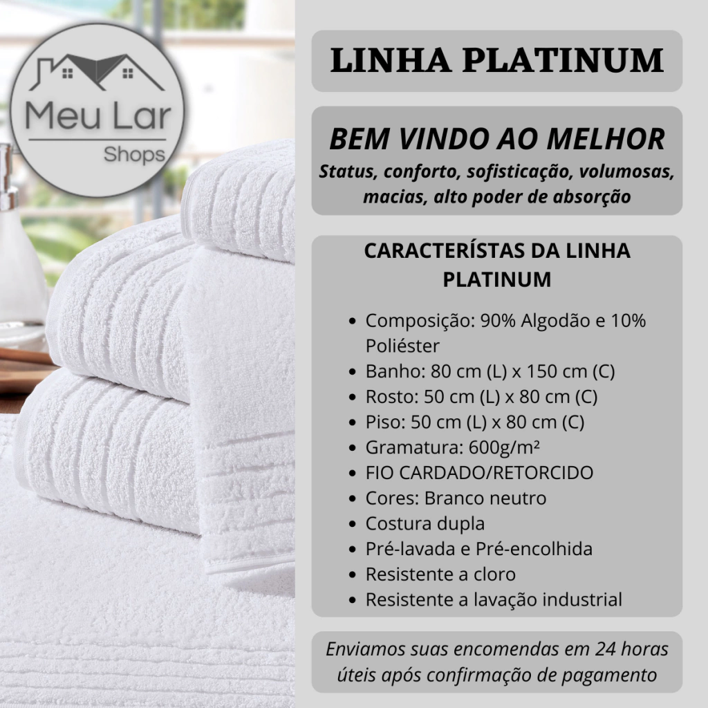 Apresentamos a melhor toalha de banho. Status, conforto, sofisticação, volumosas, macias, alto poder de absorção, são alguns dos atributos que a linha PLATINUM trará ao seu enxoval. Tendo 600 Gm2 nas linhas BANHO E ROSTO e 700 Gm2 nos pisos são ideias para hospedes que buscam alta qualidade no seu pôs banho. Sendo toda linha 90% algodão e 10%poliester, com matérias primas de alta qualidade, como o FIO CARDADO/RETORCIDO.