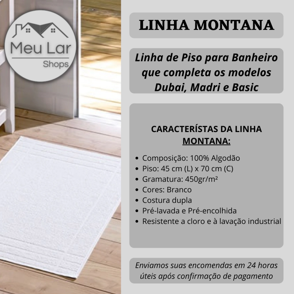 A linha Montana é produzida especialmente para garantir o conforto dos hóspedes, trazendo ainda mais qualidade ao seu estabelecimento. Com gramatura de 450 g/m², os pisos são volumosos, macios e têm alto poder de absorção. O piso Montana é confeccionado para complementar as linhas de banhos, BASIC, MADRI E DUBAI. Tendo como composição 100% algodão.